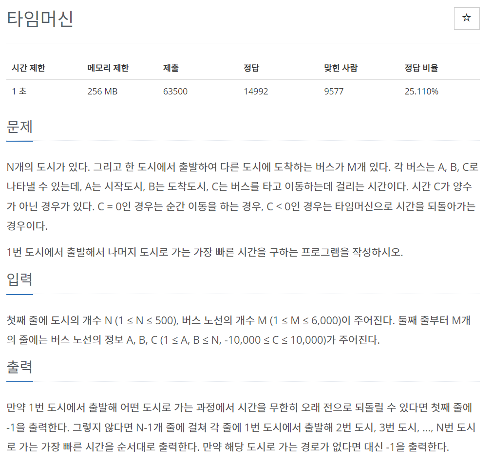 1) 음의 가중치가 존재하고, 문제 자체가 음의 사이클 또한 염두하고 있기 때문에 해당 문제는 벨만-포드 알고리즘을 사용하는 것이라고 볼 수 있습니다.