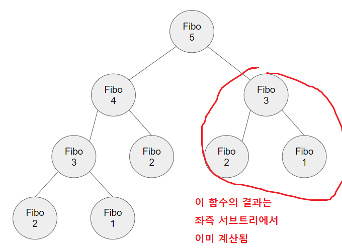 Fibo(3) 에 대한 결과는 이미 계산하였는데, 우측 좌측트리에서 Fibo(3)을 한 번 더 계산하고 있죠?