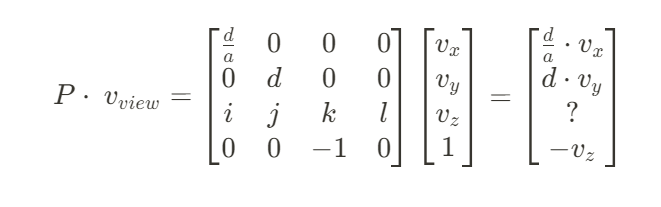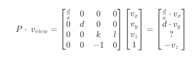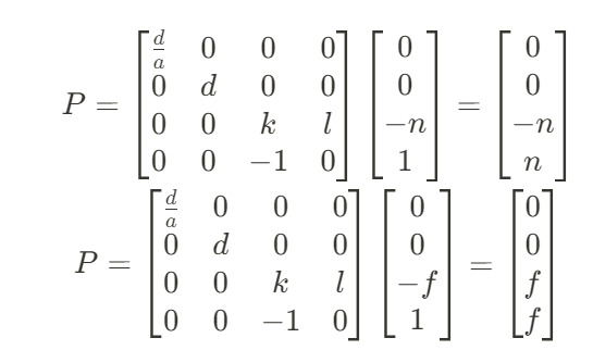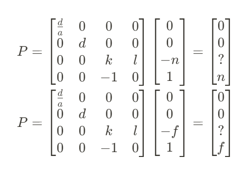 아직 원근 투영 행렬을 k와 l을 모르기 때문에 클립 좌표의 세 번째 요소를 계산할 수 없다.