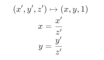 3차원 사영 공간의 점을 (x', y', z')로 표기하고 해당 점이 투영된 NDC 좌표를 (x, y)로 표기해보자. NDC 좌푯값은 사영 공간의 마지막 차원 값 z'에 반비례로 영향을 받으므로 다음과 같은 관계가 성립할 것이다.
