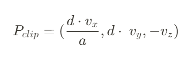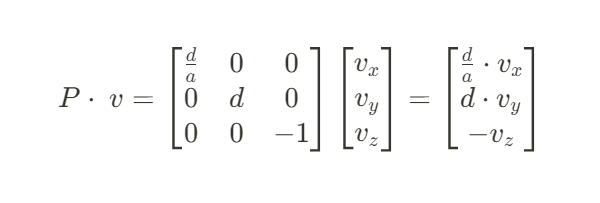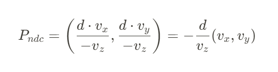두 번째 연산으로 클립 좌표의 점 P의 각 요소를 -v_z 로 나눈다. 그러면 원하는 NDC의 좌표를 얻을 수 있다.
