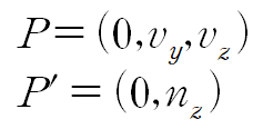 뷰 공간의 점 P로부터 투영된 점 P'의 좌표를 구해야 한다. x값은 배제했으므로 둘의 좌표는 다음과 같다.