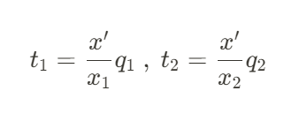 x축의 무게중심좌표 (t1, t2)도 다음과 같은 수식이 성립한다.