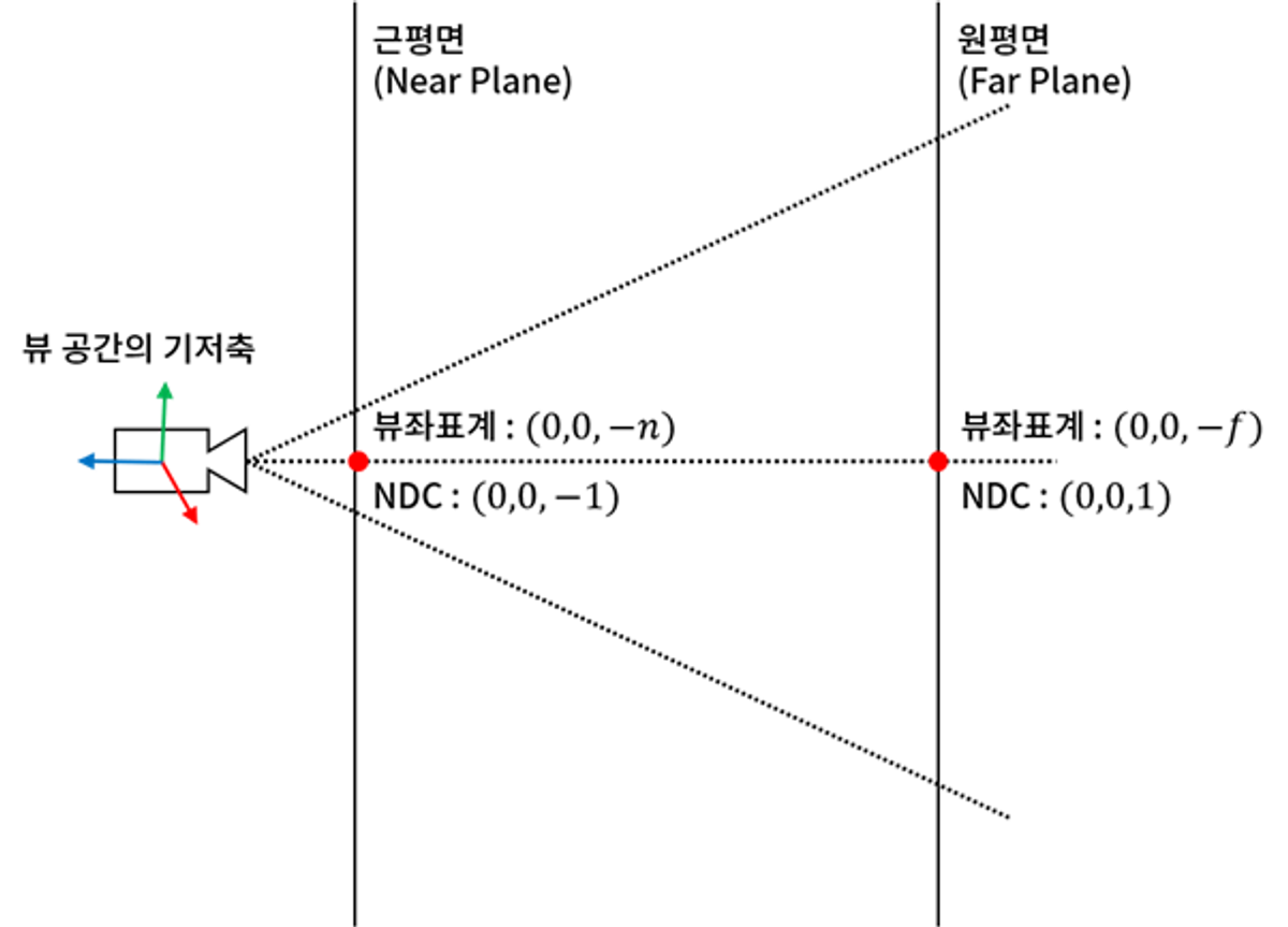 뷰 공간에서 카메라 시선 방향은 -z축이므로 뷰 공간에서 이 점의 좌표는 (0, 0, -n, 1) 이 된다.