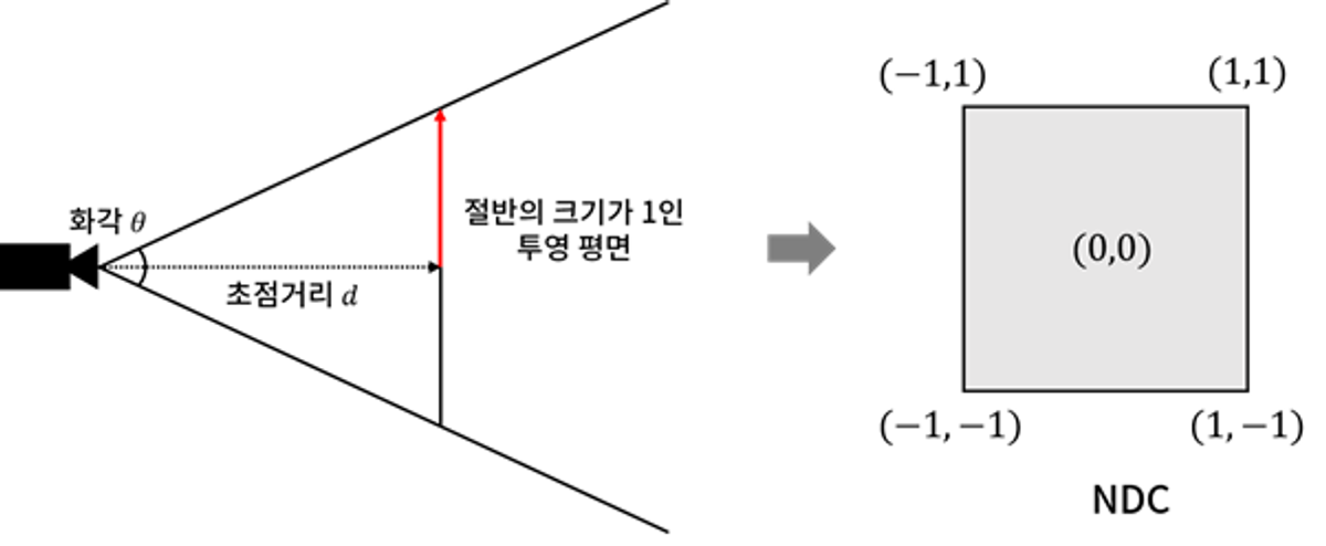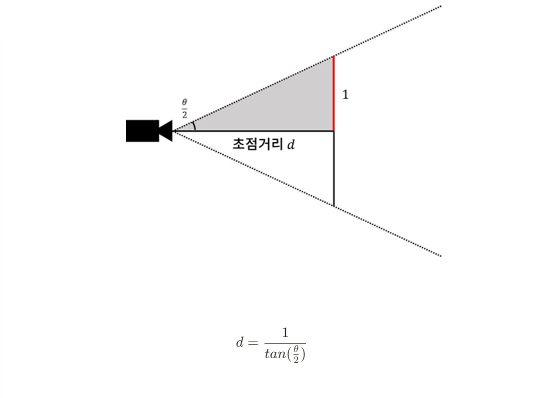 투영 평면에 대응하는 NDC가 언제나 [-1, 1] 값을 가져야 한다면, 카메라에 설정된 화각이 바뀔 때, 초점 거리를 달라져야 한다.