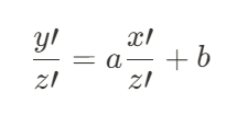 이번에는 NDC 공간에서 직선의 방정식 y = ax + b 를 생각해보자. 이 NDC 공간의 직선이 실은 사영 공간의 점들이 투영되어 만들어졌다고 생각해보자.