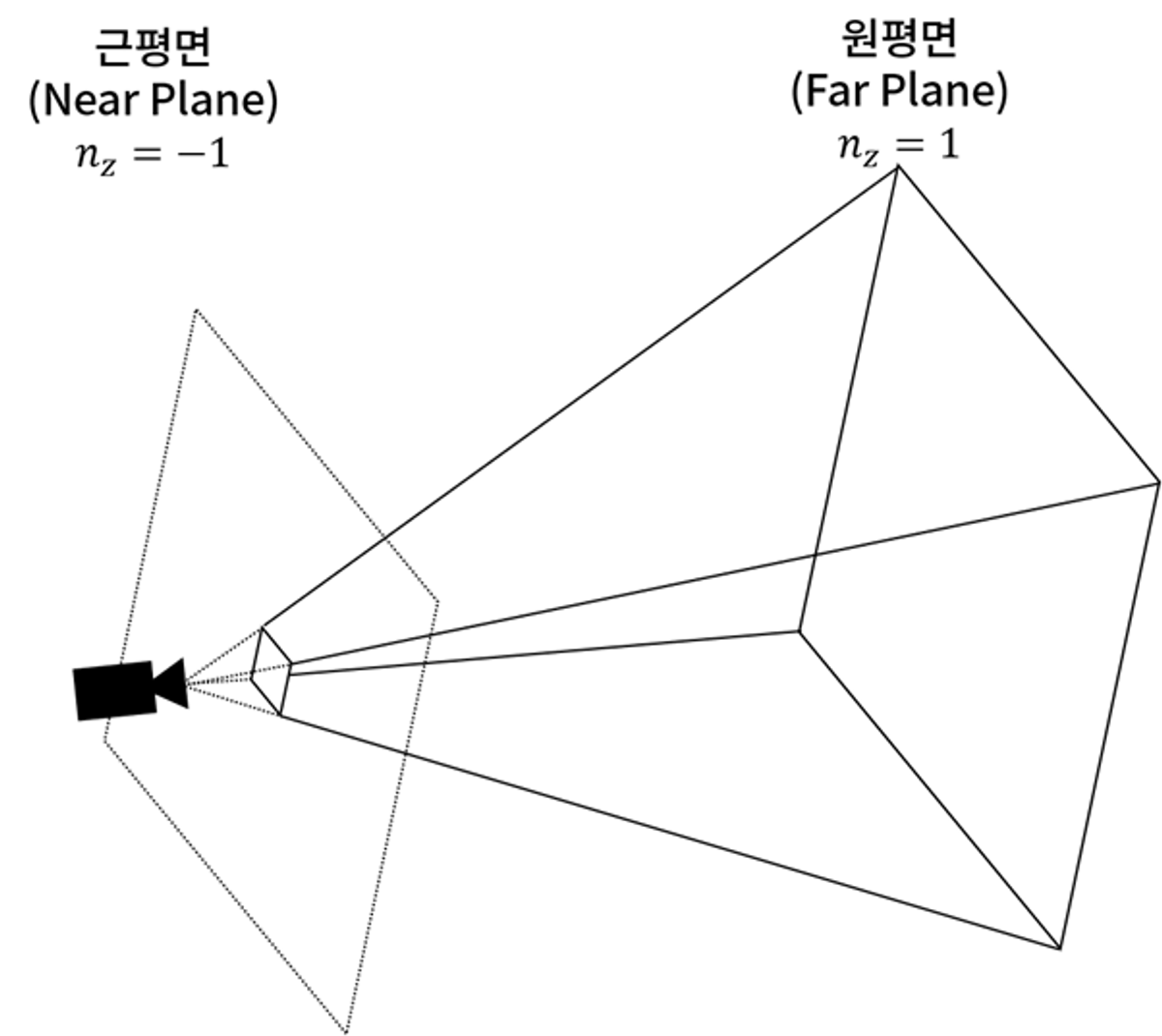 이런 유클리드 공간에서 사각뿔 형태로 원근 투영 변환해야 하는데, 이러한 사각뿔 공간을 사영 공간이라고 한다.