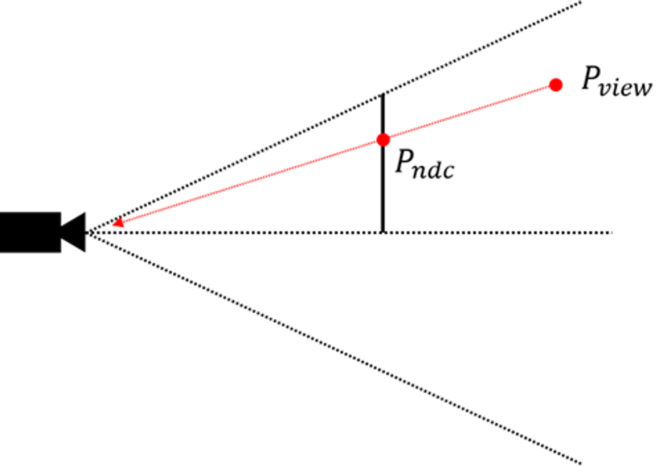 카메라 좌우와 상하의 시야각은 동일하므로 NDC의 x값 또한 y값을 0으로 고정한 후에 x축과 z축의 평면을 사용하는 방식으로 구할 수 있다.