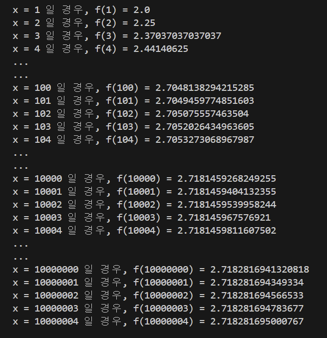 위 자연상수식은 무리수 e로 수렴한다고 설명할 수 있다.