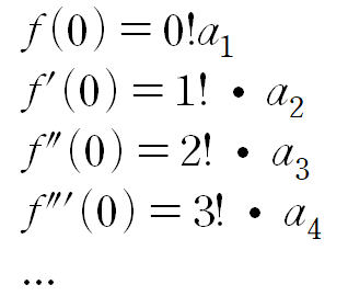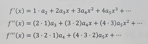 이 함수가 만약 무한 미분 가능하다고 할 때, 해당 멱급수의 미분식은 다음과 같다.