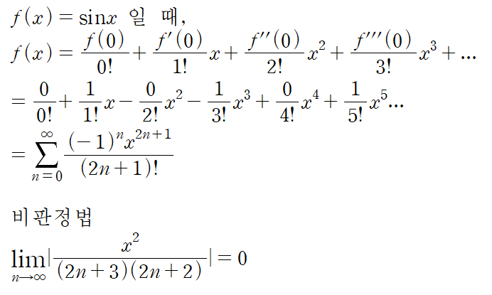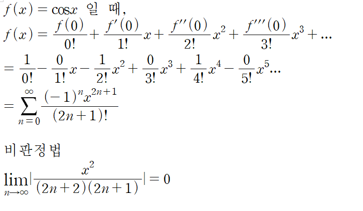 즉, 자연지수함수, cos, sin 함수 모두 매클로린 급수 전개가 가능하다.