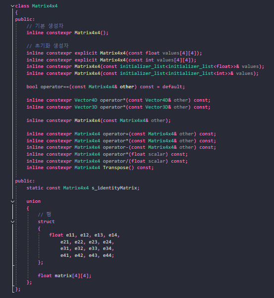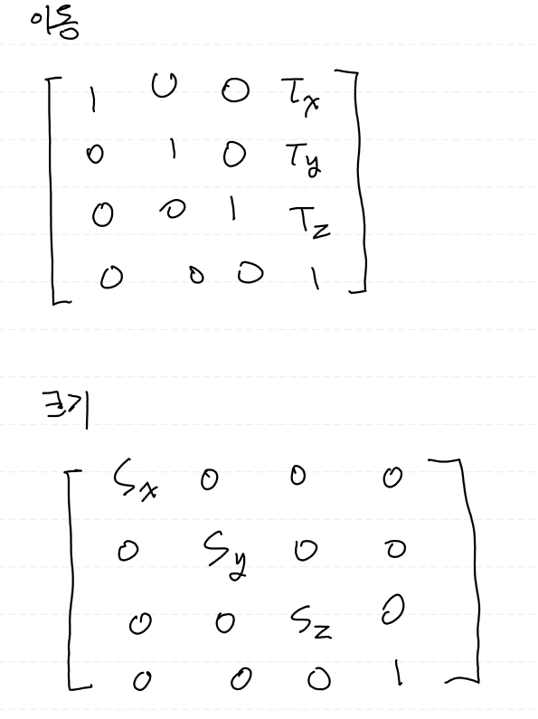 3차원에서 자유로운 선형 변환을 위해 3차원 벡터 및 4x4 정방행렬을 정의해야 합니다.