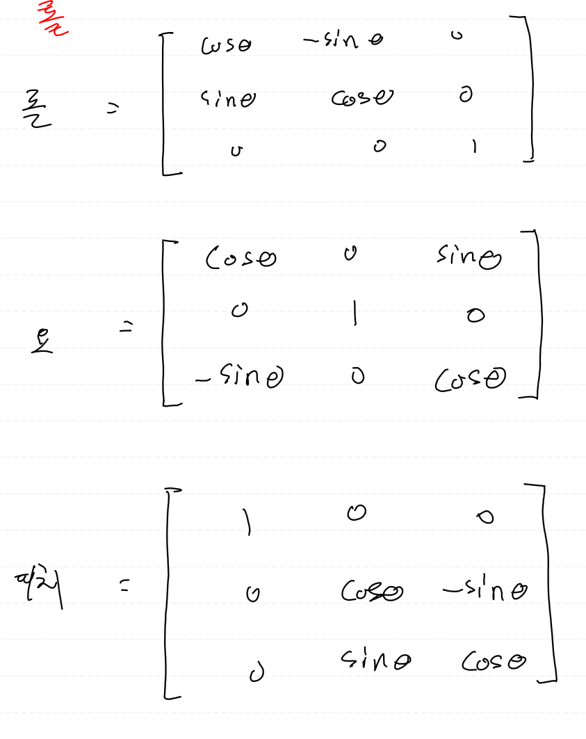 오일러 각을 이용해서 회전 행렬을 만드는 방법은 다음과 같습니다.
