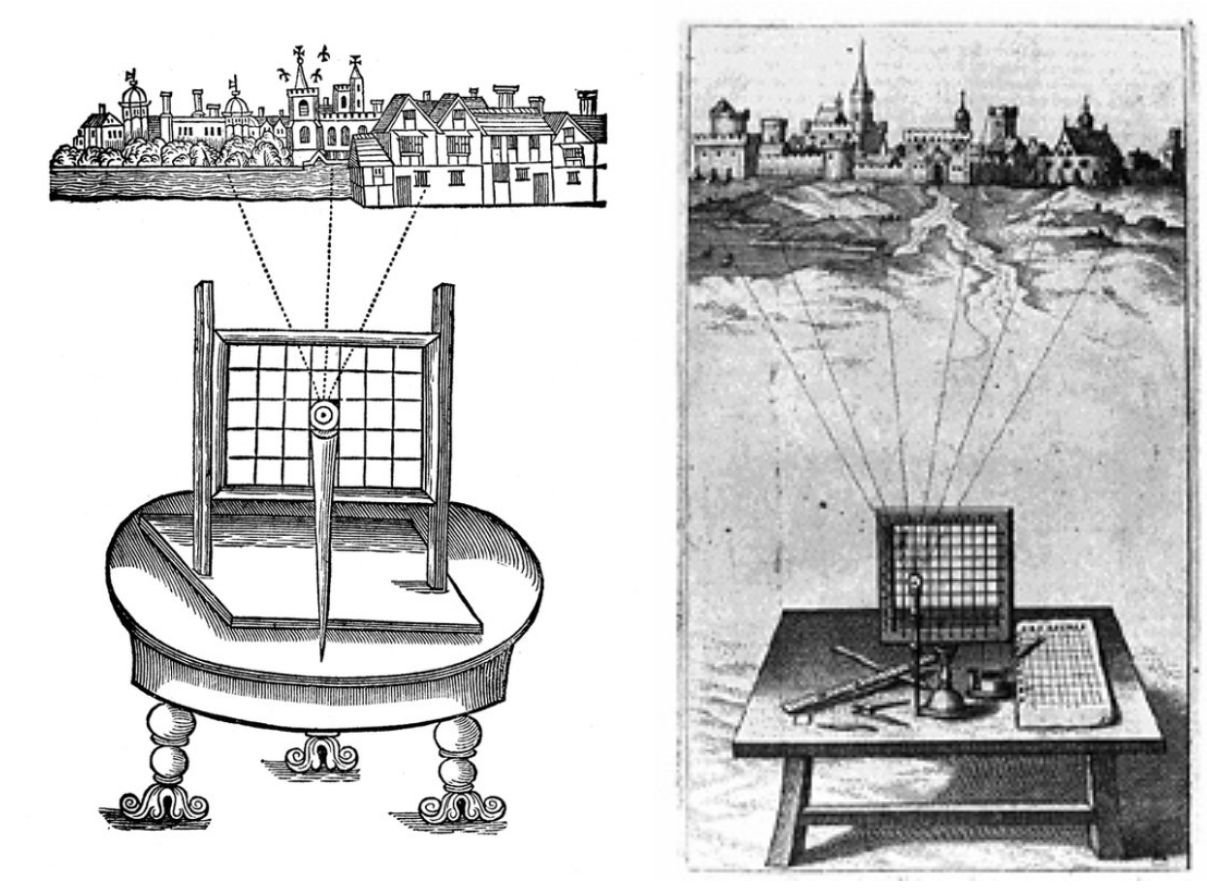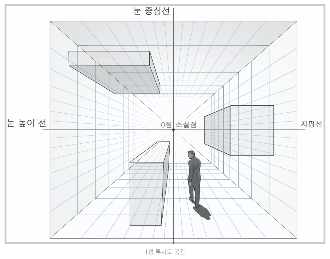 가상의 선과 눈앞의 특정 평면이 만나는 곳을 참고하여 원근을 구현하는 기법은 15~16세기 미술에서 유행하던 기법이라고 합니다.