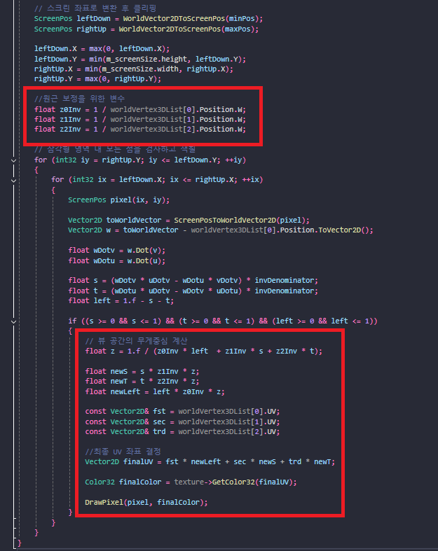 그 이유는 NDC 좌표로 투영된 정점을 가지고 무게중심 보간을 수행했기 때문입니다.