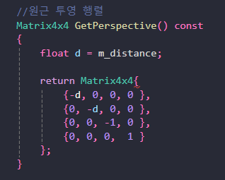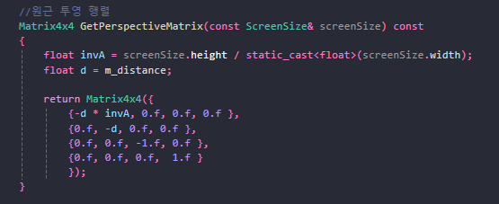그 다음, 원근 투영 행렬을 얻어내는 함수를 정의해봅시다.