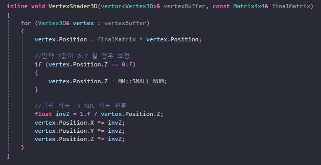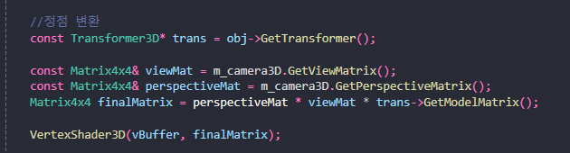 최종 행렬에 원근 투영 행렬을 곱해줍니다.