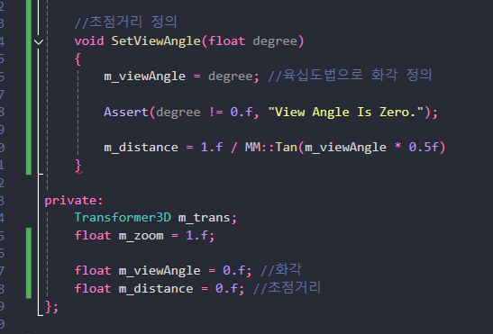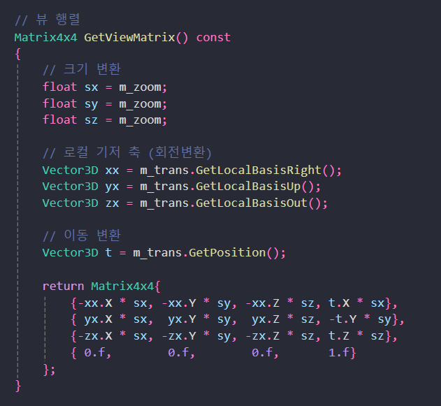 이를 구현하기 위해서 뷰 변환 행렬에서 사용되는 카메라의 Right, Out 로컬 기저축을 반전시켜주었습니다.