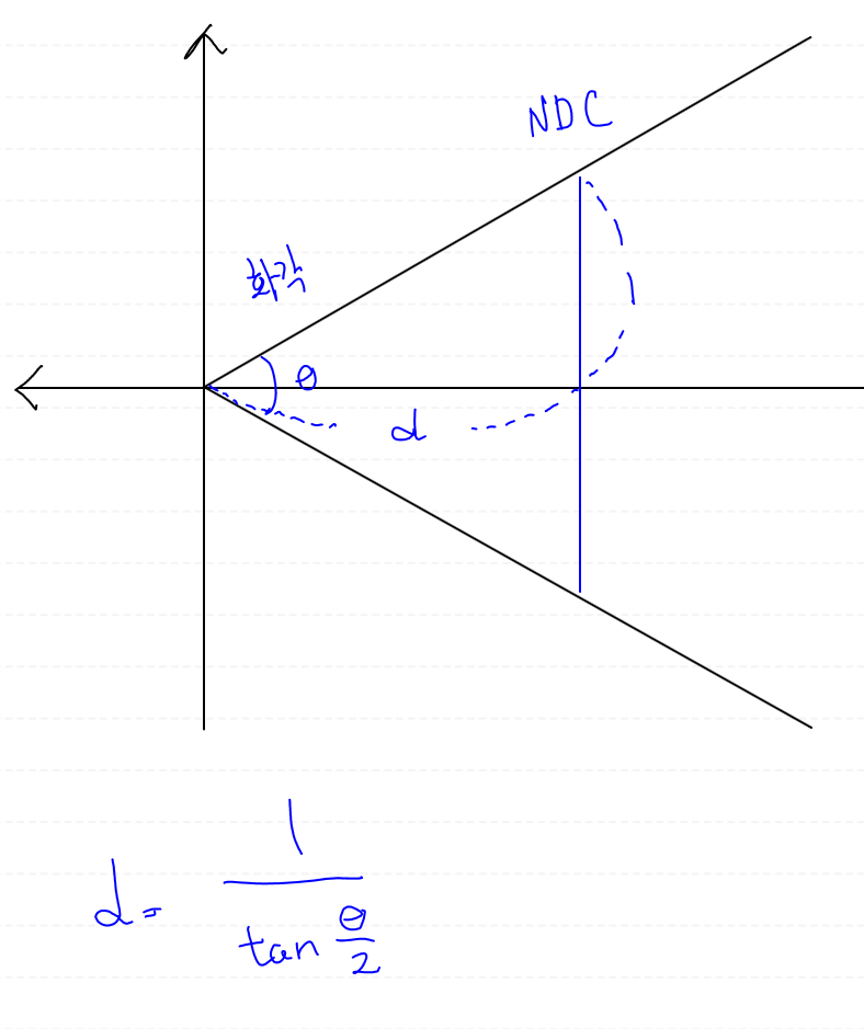 나중에 NDC 평면을 이용해서 많은 연산을 수행해야하기 때문에 계산이 단순성을 위해 일반적으로 NDC의 크기는 상하좌우 1씩 즉, 상하 [-1, 1] 좌우 [-1, 1] 의 크기를 가지도록 고정합니다.
