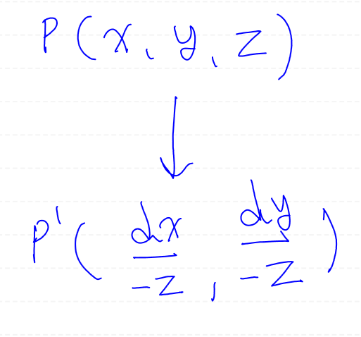 투영한 점 P'를 구하기 위해서는 삼각형의 비를 사용해서 어떤 y점을 구할 수 있습니다.