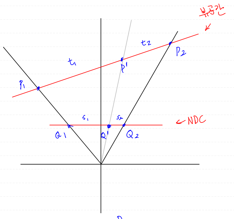 이제 NDC에 어떤 정점 P를 투영해봅니다.