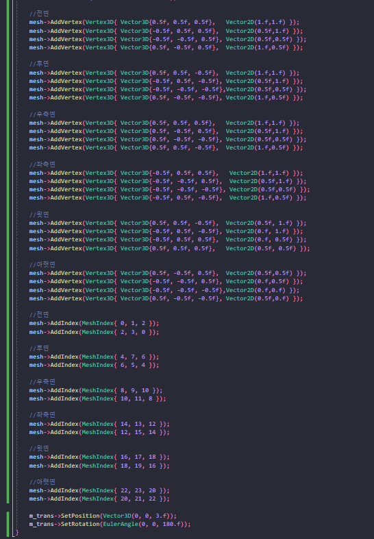 색상값, 그리고 텍스처 매핑이 필요할 경우 사용할 UV 좌표계가 존재합니다.