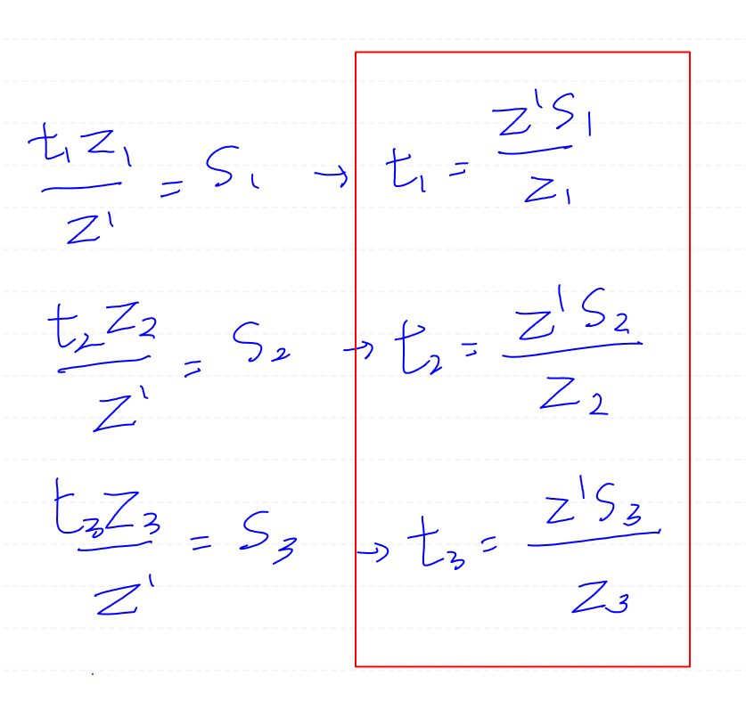 우리가 구해야하는 것은 t1, t2, t3 이니까, t에 대한 식으로 고쳐줍니다.