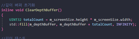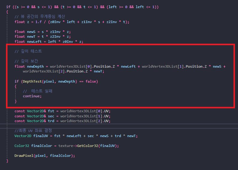 깊이 값 역시 원근 투영 전 정점을 기준으로 보간을 수행해야하기에, 원근 보정 보간을 수행합니다.