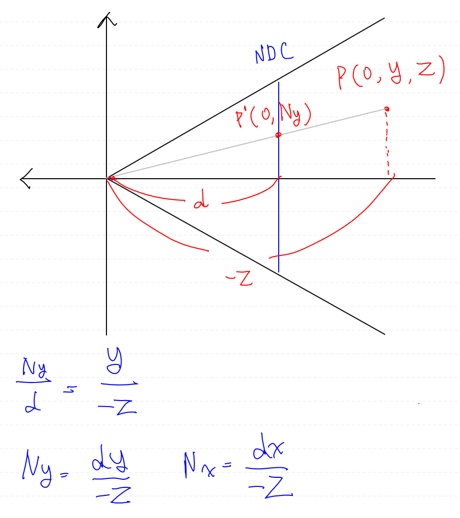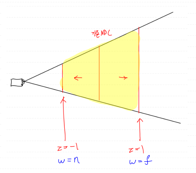 카메라의 옆쪽에서 보면 NDC 평면이 위와 같이 확장되는 것으로 이해할 수 있습니다.