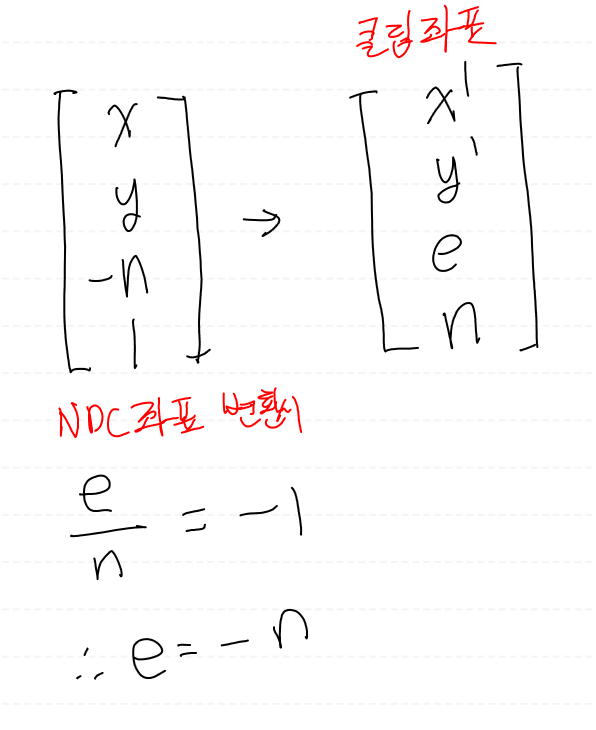 근평면의 뷰 좌표 (x, y, -n, 1) 을 클립좌표로 변환시켰을 때,