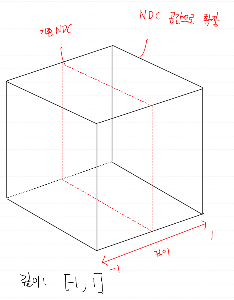 그러기 위해서 NDC 평면에 깊이에 대한 개념을 첨가하면 위와 같은 공간이 됩니다.
