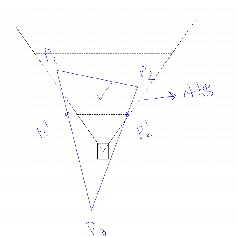 삼각형을 축소시키는 방법은 절두체와 삼각형이 접하는 점을 P'2, P'3 라고 할 때,