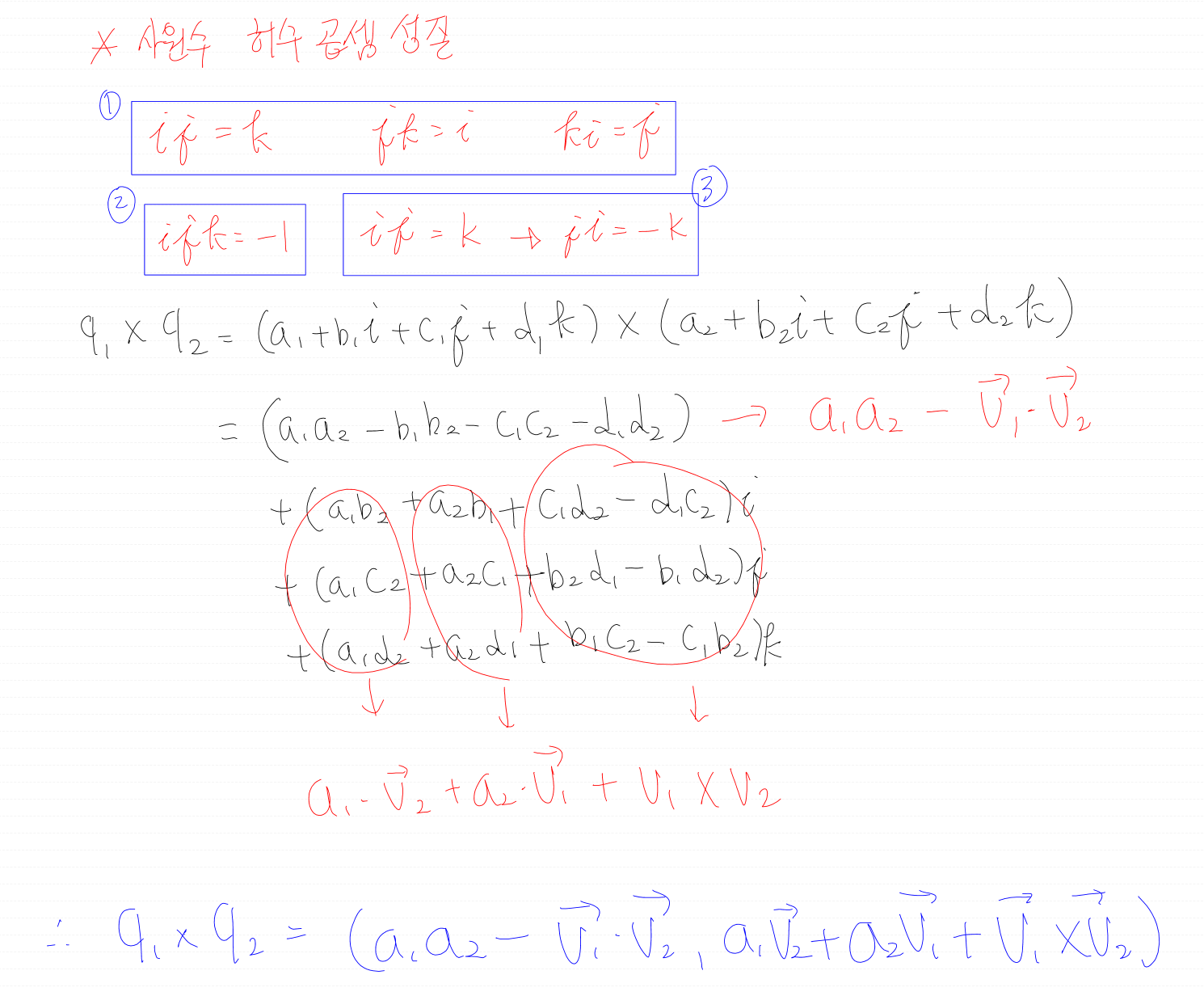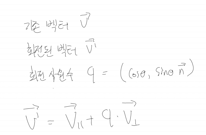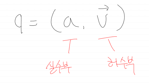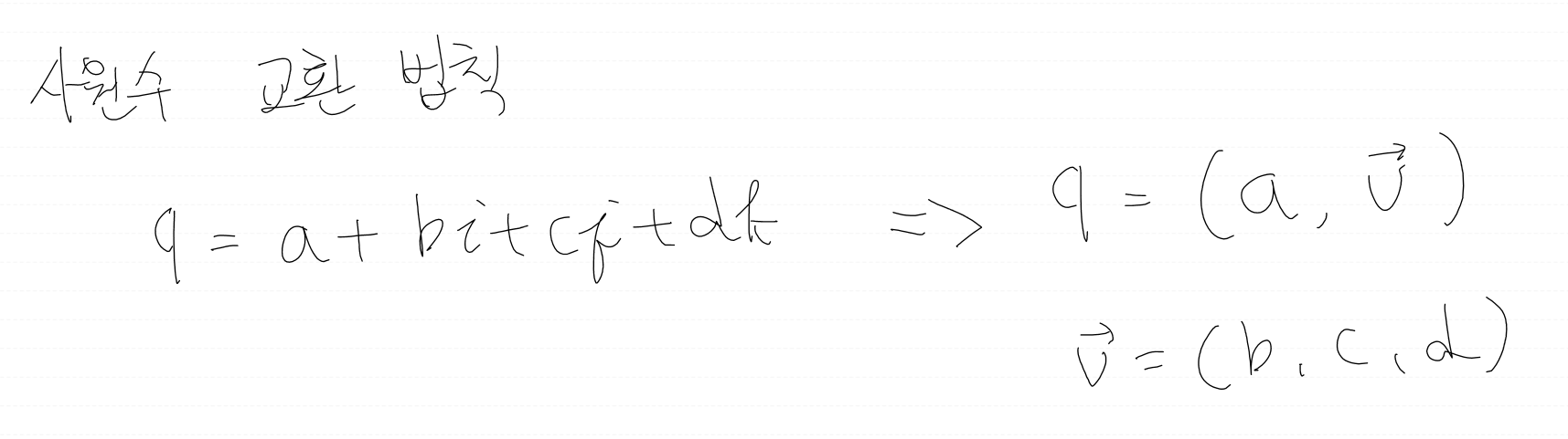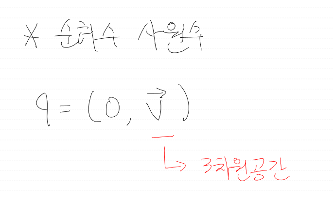 여기서 실수부가 0인 사원수를 순허수 사원수라고 부르며, 이런 특수한 사원수를 이용해서 3차원 공간의 벡터를 표현합니다.