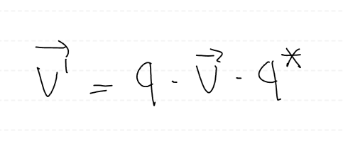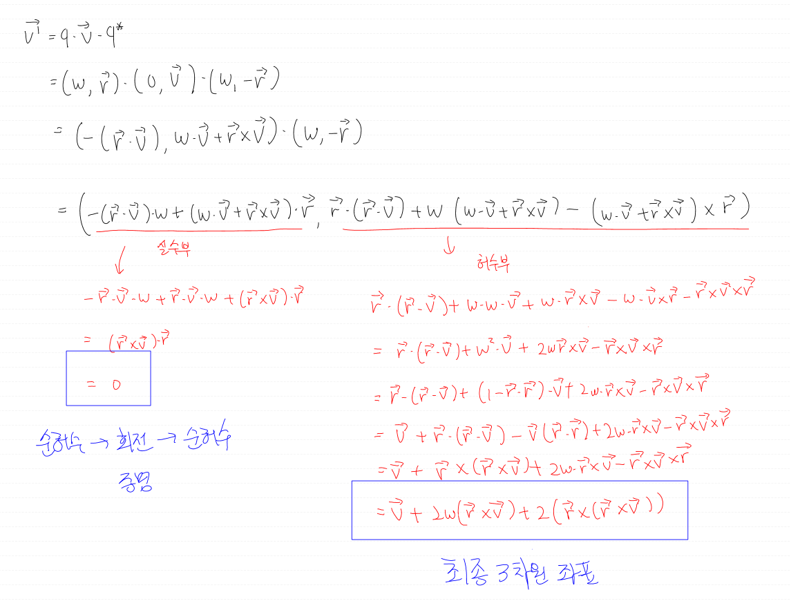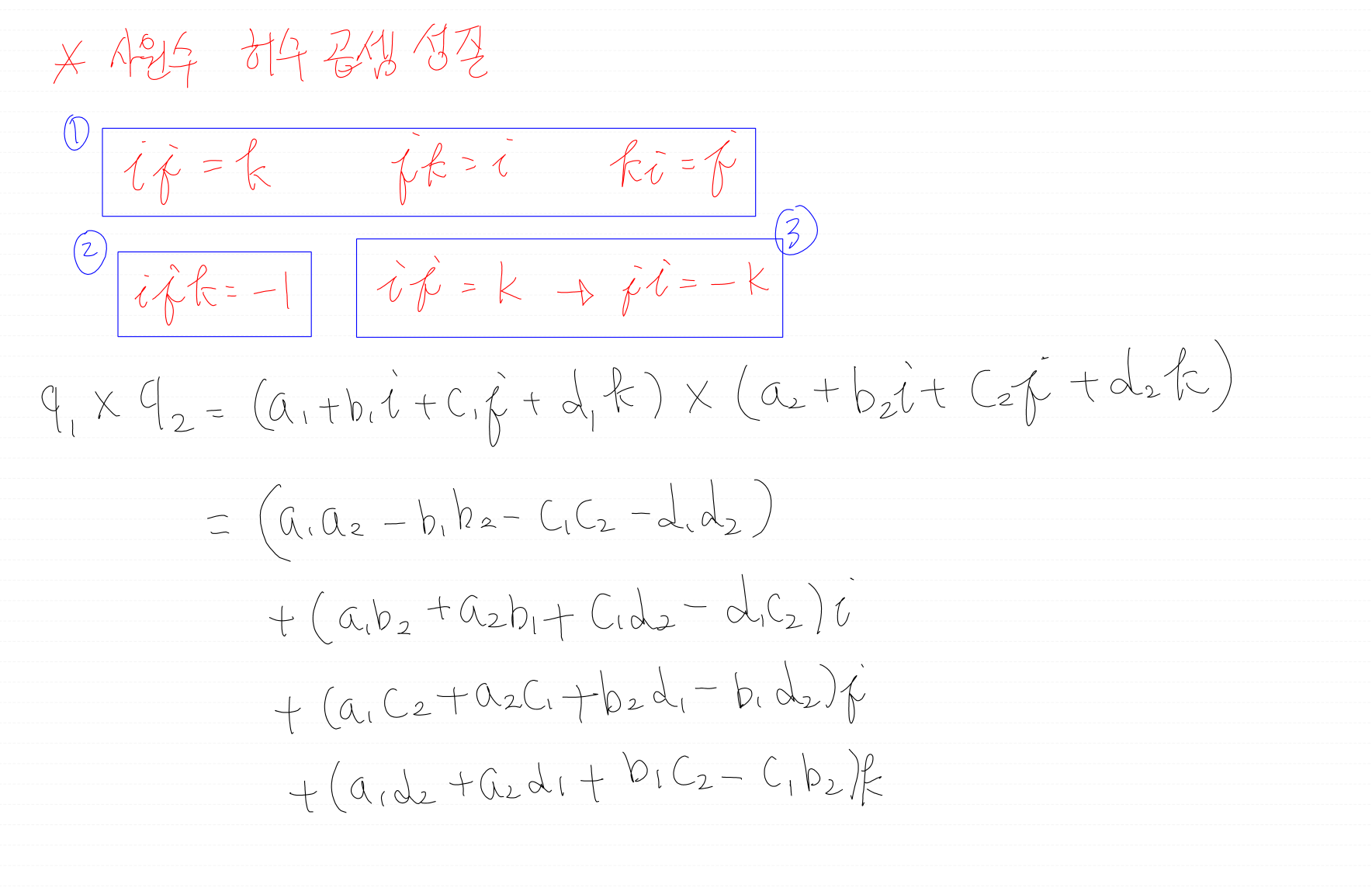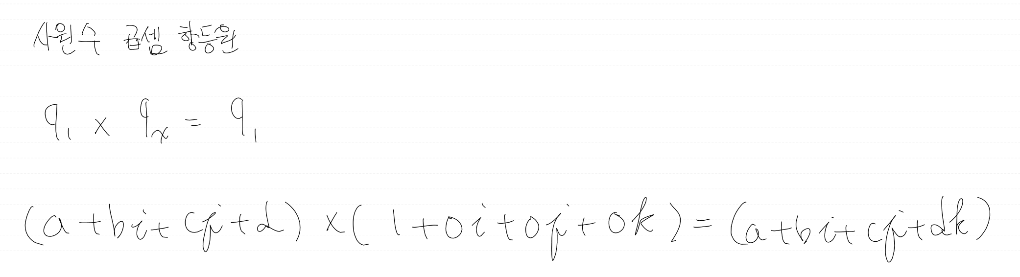 여기서 실수부가 0인 사원수를 순허수 사원수라고 부르며, 이런 특수한 사원수를 이용해서 3차원 공간의 벡터를 표현합니다.