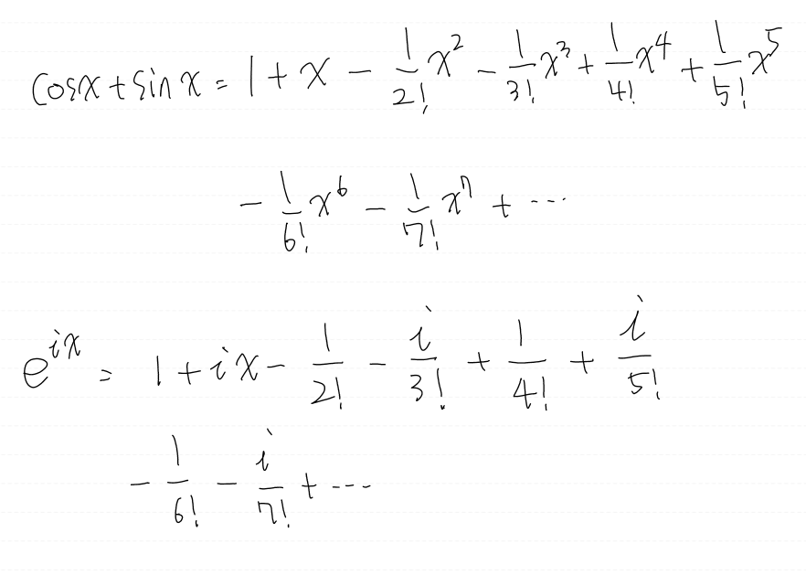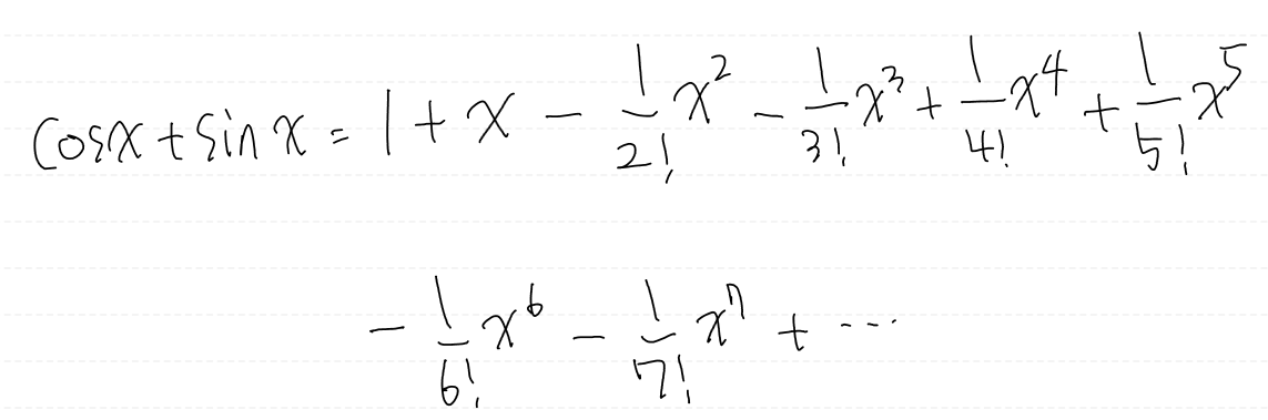 cos과 sin를 더해보면, 그 꼴이 e 지수함수와 매우 유사해집니다.