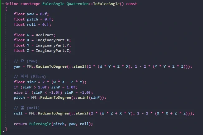 그러면 사원수 구조체에 오일러 각을 받아주는 생성자를 만들어보겠습니다.