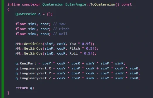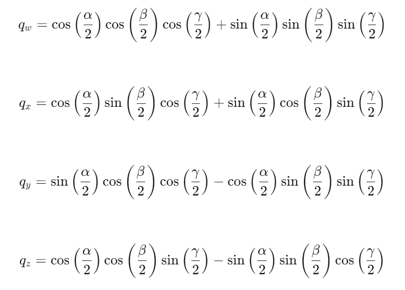 그러므로 오일러각과 동일한 회전 축으로 3개의 회전 사원수를 구한 뒤 조합하면 오일러 각을 사원수로 변환할 수 있을겁니다.