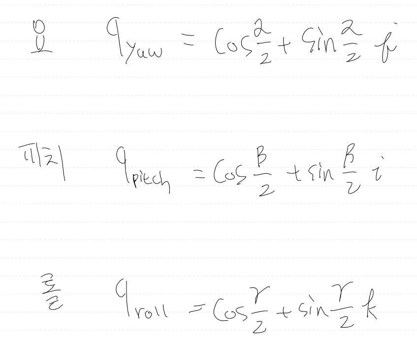 요, 피치, 롤에 해당하는 회전 사원수는 다음과 같고