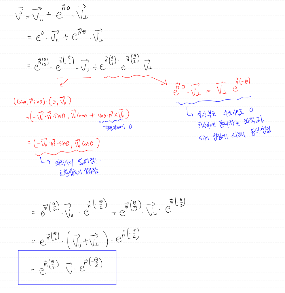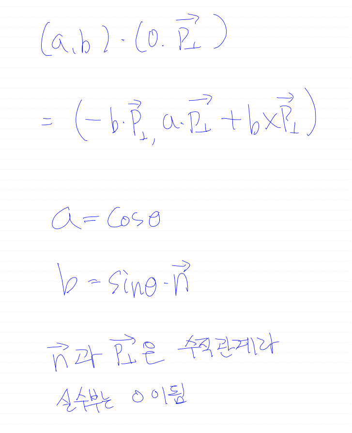 위와 같이, 간단하게 회전 결과를 벡터의 외적, 스칼라 곱셈으로 나타낼 수 있습니다.