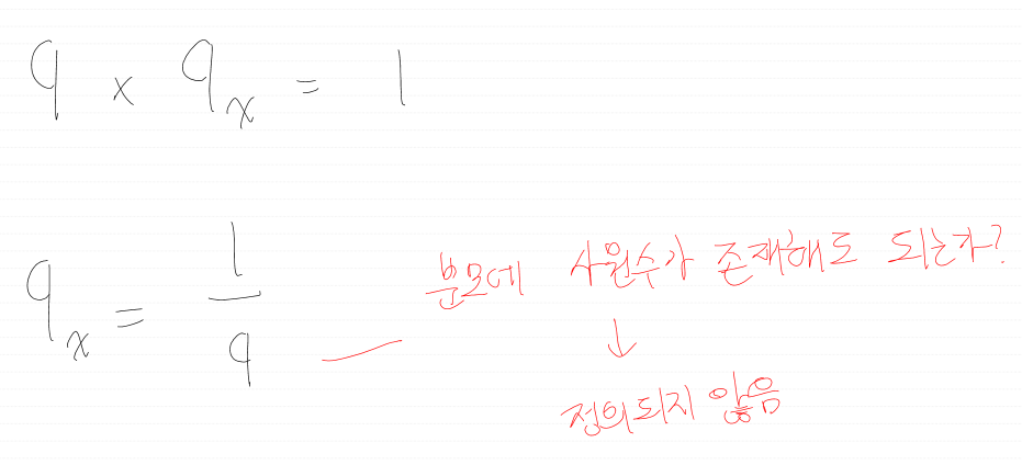 실수 곱셈에서 역원을 구하는 것처럼 사원수의 곱셈 역원을 구하려고 하나... 분모에 사원수가 존재하는 경우는 정의되지 않기 때문에 이러한 방법으로는 역원의 존재를 확인할 수 없습니다.
