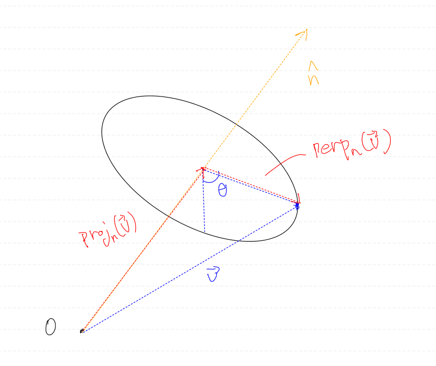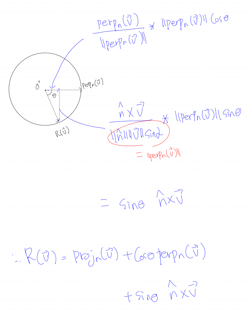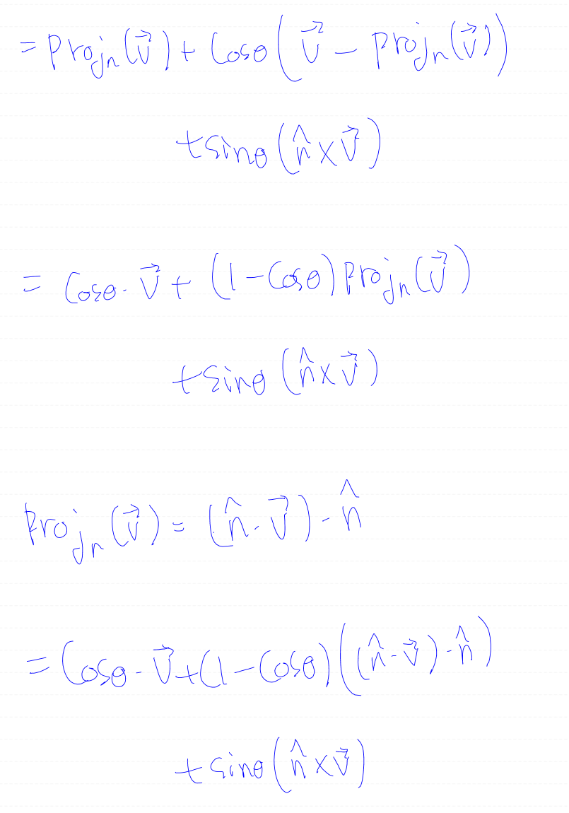 회전축에 수직인 성분만 세타만큼 회전시킨다음, 수평 성분과 더하면 회전시킨 벡터를 구할 수 있을 것이다.