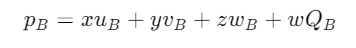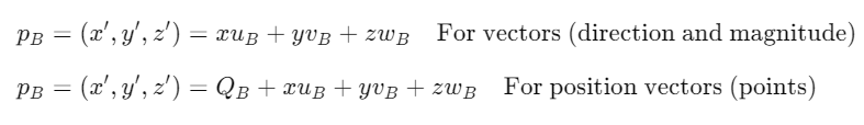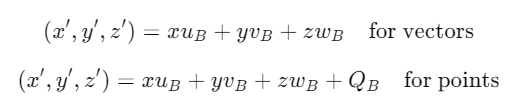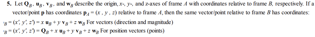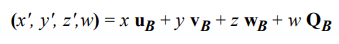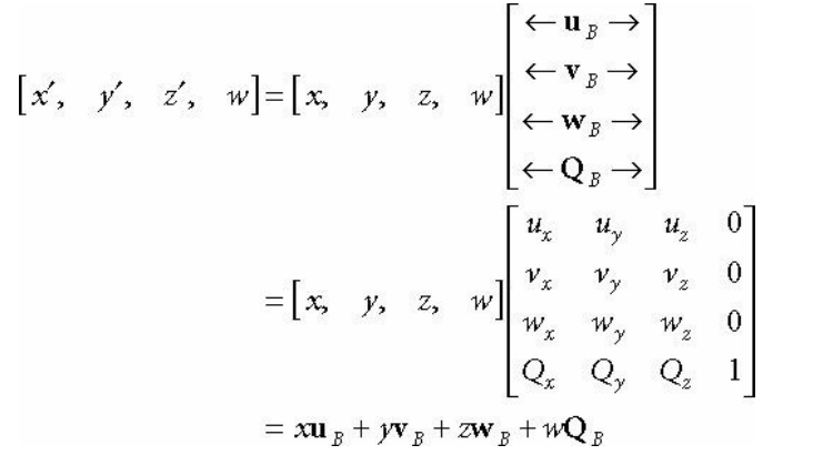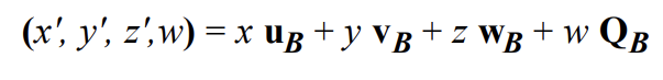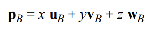 QB, uB, vB, wB 가 각각 B 좌표계에 대한 A 좌표계의 원점, x축 기저, y축 기저, z축 기저를 나타낸다고 할 떄
