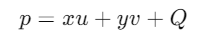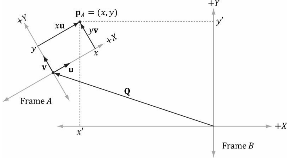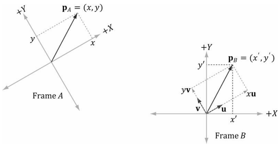 A 좌표계에서 정의도딘 좌표 p는 B 좌표계에서 다음과 같은 좌표를 가진다.