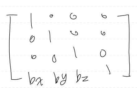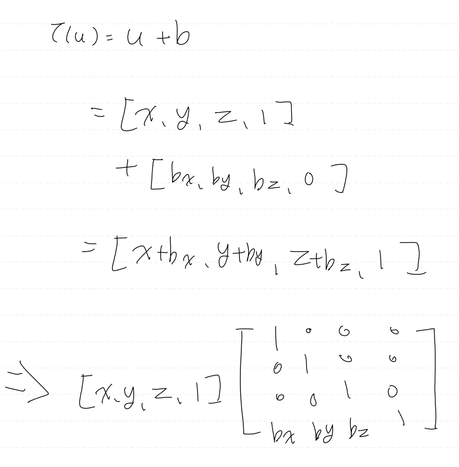 그러나 앞서 보았듯 데카르트 좌표계에서는 이동 변환이 선형성을 가지지 않기 때문에