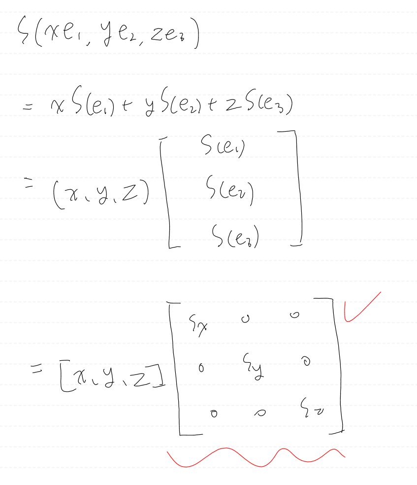 행렬 표현을 찾기 위해 우리는 S를 표준 기저 벡터 각각에 적용하고, 그 결과 벡터를 행렬의 행에 배치한다.
