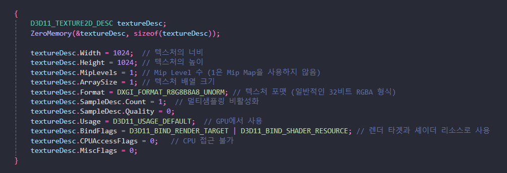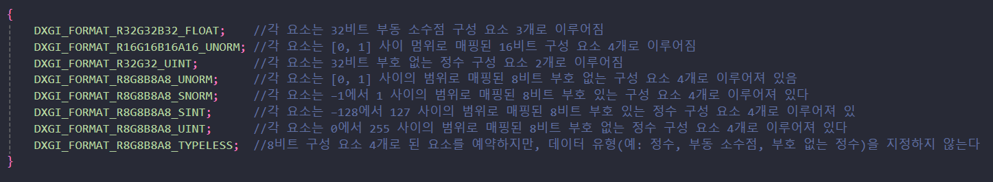또한, 텍스처는 임의의 데이터를 저장할 수 없으며, DXGI_FORMAT 열거형 타입으로 설명된 특정 데이터 형식만 저장할 수 있다.