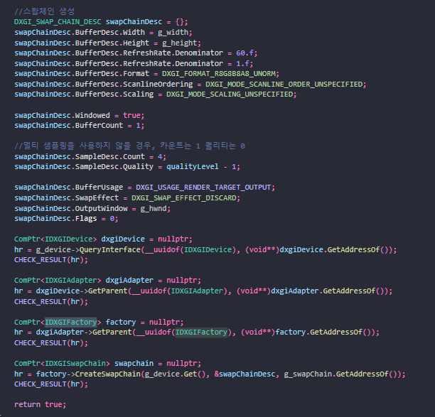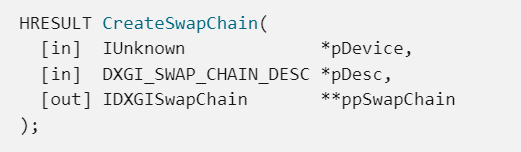 해당 CreateSwapChain 함수는 IDXGIFactory의 멤버함수이기 때문에
