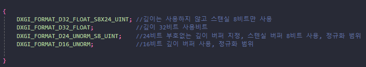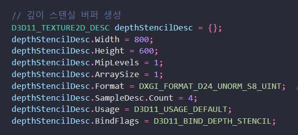 깊이/스텐실 버퍼를 사용하기 전에, 파이프라인에 바인딩할 깊이/스텐실 뷰를 생성해야 한다.