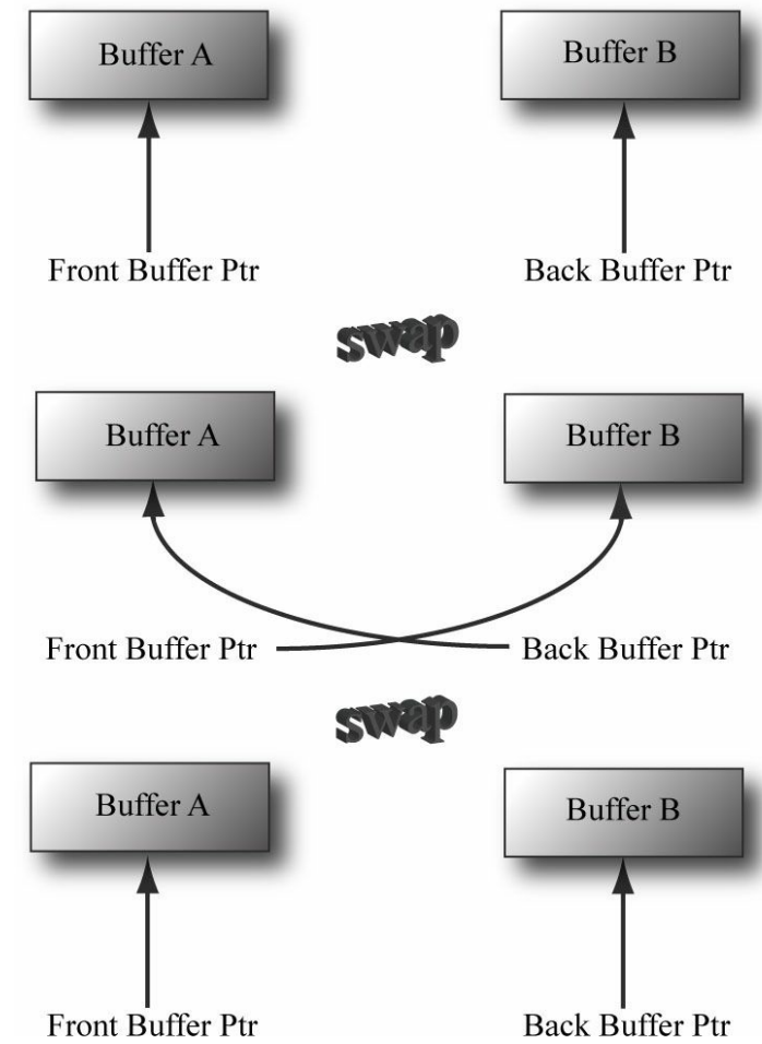 프레임이 백 버퍼에 다 그려지면, 백 버퍼와 프론트 버퍼의 역할이 바뀐다. 백 버퍼가 프론트 버퍼가 되고, 프론트 버퍼는 다음 애니메이션 프레임을 위한 백 버퍼가 된다.