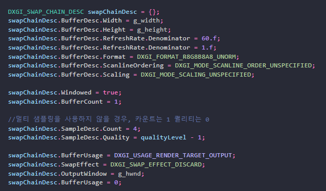 3. 백 버퍼 사용 목적 DXGI_USAGE_RENDER_TARGET_OUTPUT 설정하여 백 버퍼에 그릴 것을 지정한다.